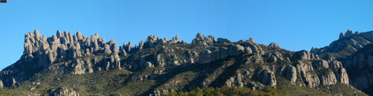Поднимаемся пешком или на фуникулере на вершину горы Монтсеррат, откуда открывается удивительной красоты пейзаж, на высоту 1200 метров над уровнем моря. Сверху видна практически вся Каталония. Хотя, заметить это практически не успеваешь, восхищаясь необычным формам камней и бурной растительности, украшающей склоны гор. Горы необыкновенно красивы, причудливые каменныe образования местами похожи на замки из мокрого песка, а местами напоминают огромных истуканов, вызывающих одновременно восхищение и ужас, которые иногда называют Мумия, Брюхоепископа, Хобот слона, Лошадь Бернарда.